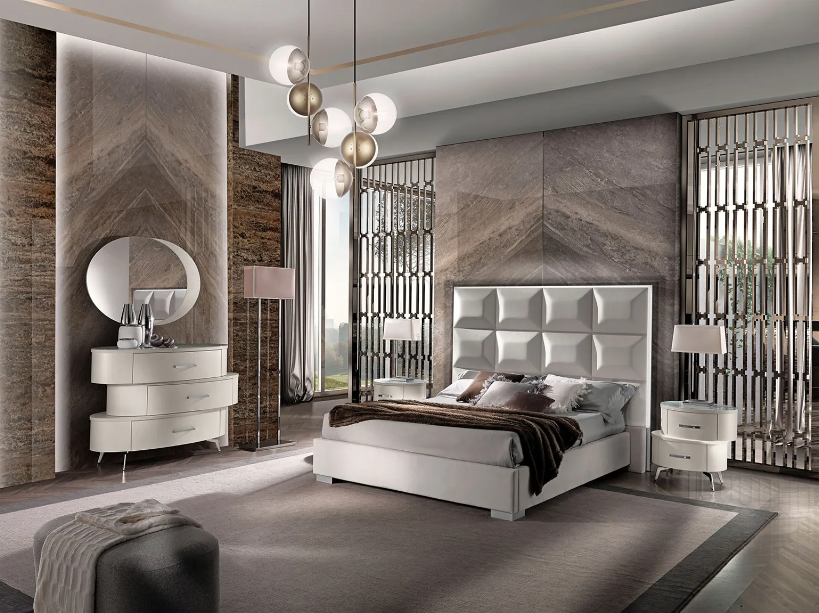 Il gruppo notte Movida Luxury di Mobilpiù è concepito per trasformare l'ambiente con un'estetica sofisticata e funzionale. Questa linea si distingue per l'impiego di finiture in ecomalta bianca, complementate da piani in vetro che riproducono fedelmente l'effetto del marmo Nero/Oro. I dettagli in metallo, con una preziosa finitura in bagno oro per maniglie e basamenti, sottolineano l'eccellenza costruttiva. La collezione Movida Notte armonizza sapientemente l'artigianalità tradizionale con le più innovative tendenze del design italiano. I comodini, realizzati con pannelli di legno multistrato sagomati e rivestiti in ecomalta bianca, sono supportati da piedi in metallo galvanizzato oro, presentando dimensioni di 64 cm in larghezza, 47 cm in profondità e 65 cm in altezza. Il comò a tre cassetti offre una soluzione di contenimento ottimale, con misure di 146 cm di larghezza, 60 cm di profondità e 101 cm di altezza. Ogni elemento è fabbricato in solido legno massello di abete; i cassetti sono dotati di sistemi di scorrimento Blumotion ammortizzati e integrano un'illuminazione perimetrale a LED, confermando l'attenzione ai massimi standard di qualità e durabilità. Queste caratteristiche tecniche avanzate garantiscono non solo un'estetica impeccabile ma anche prestazioni e resistenza nel tempo.