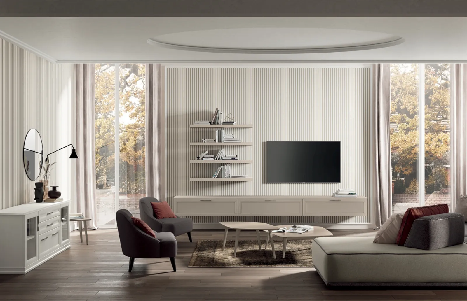 La parete Arcadia AS009 offre una grande modularità e configurazioni personalizzabili, permettendoti di creare la soluzione ideale per il tuo soggiorno. Puoi integrarla con illuminazione LED e scegliere tra diverse tipologie di ante.