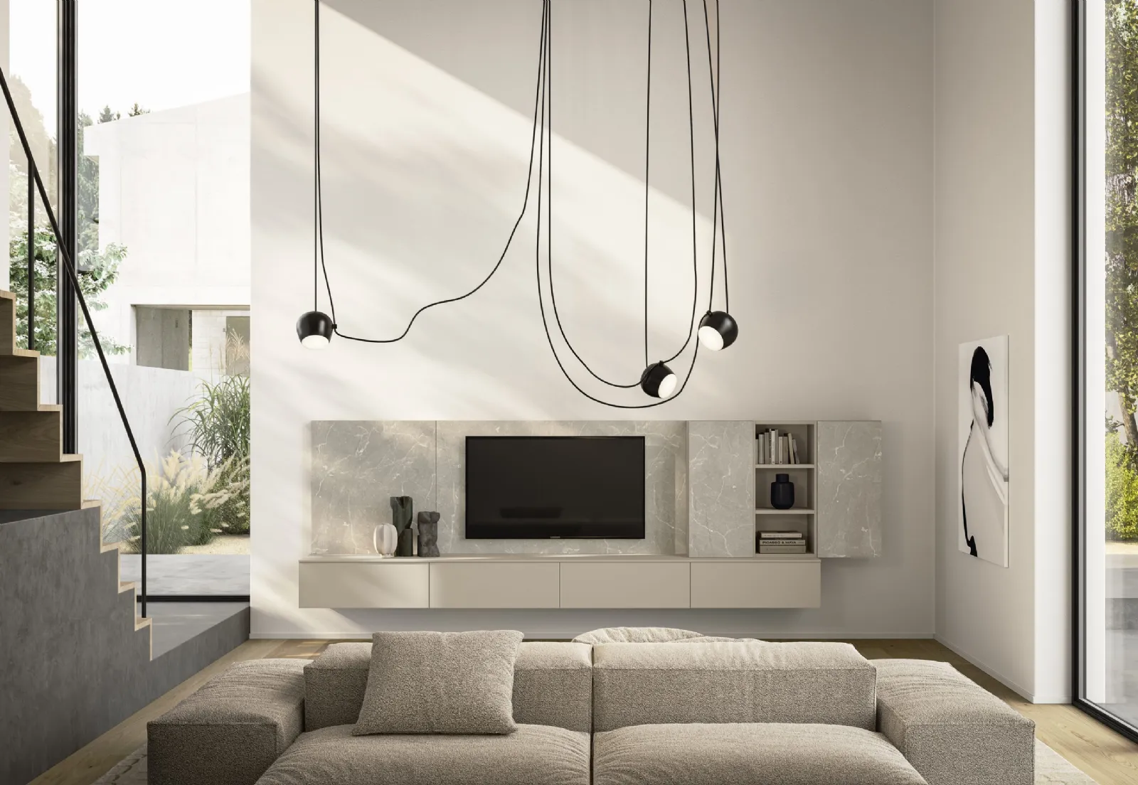 La parete attrezzata Night & Day L03NS è altamente modulare e può includere basi, pensili, colonne, moduli TV con passacavi integrati e mensole a giorno, permettendo configurazioni personalizzate per il tuo spazio.
